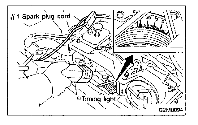 2. To check the ignition timing, connect a timing light to #1 cylinder spark plug cord, and illuminate the timing mark with the timing light.