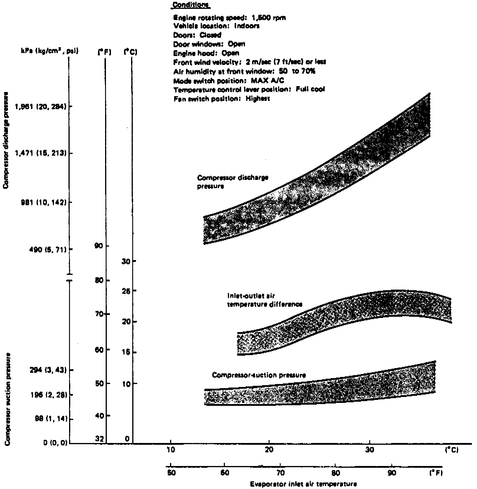 The cooling performance of the air conditioner changes considerably with changes in surrounding conditions. To check for correct system operation, follow procedure outlined below:1. Park the vehicle indoors or in the shade.