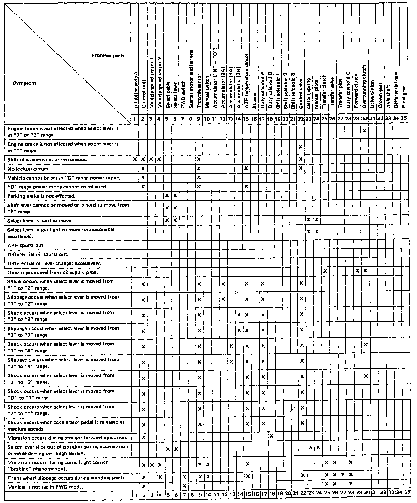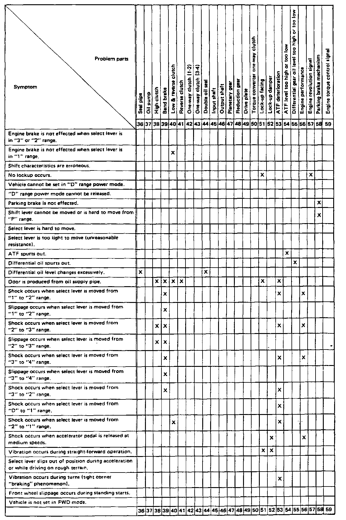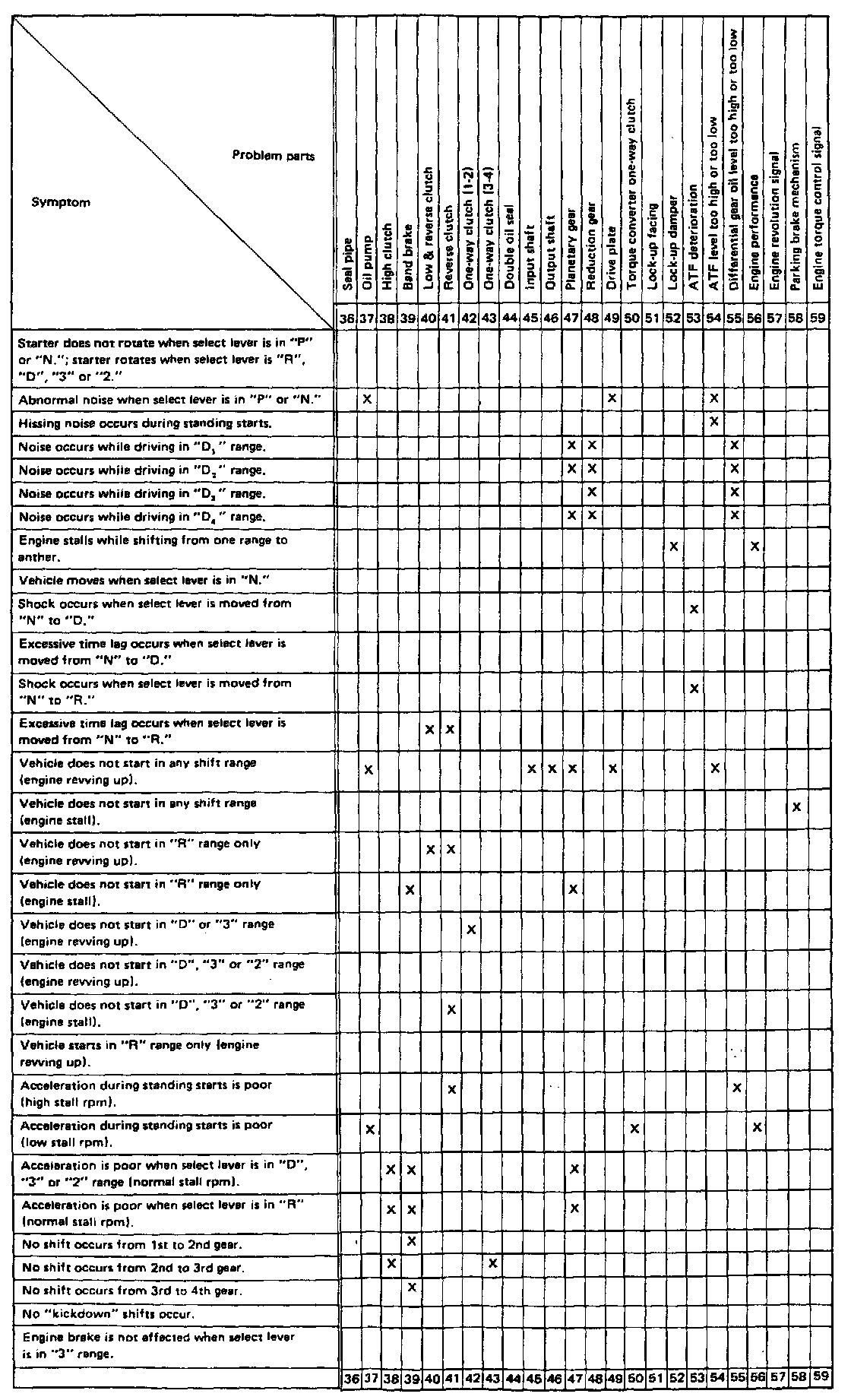 Problems in the electronic controlled automatic transmission may be caused by failure of the engine, the electronic control system, transmission components or by any combination of these. Troubleshooting should be started with simple and easy operations then proceeding to complicated and more difficult operations. When troubleshooting the transmission system, refer to Fig. 2, for the general troubleshooting chart.
