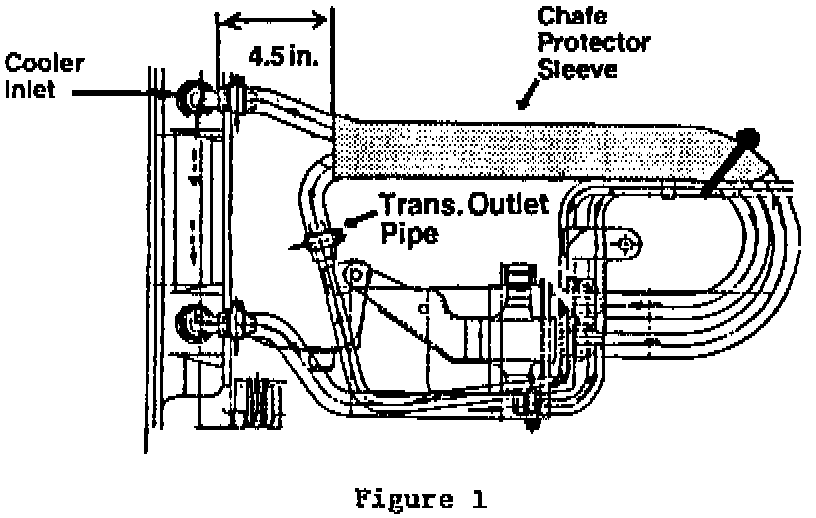 3. There have been several variations of filter kits available. All kits for Legacys are mutually interchangeable. However, to help minimize the possibility of the hoses being pinched or kinked which would cause a restricted fluid flow, make sure that both hoses that go to the cooler inlet and the transmission outlet pipe protrude at least 4-1/2" from the end of the chafe protector. See Figure 1.