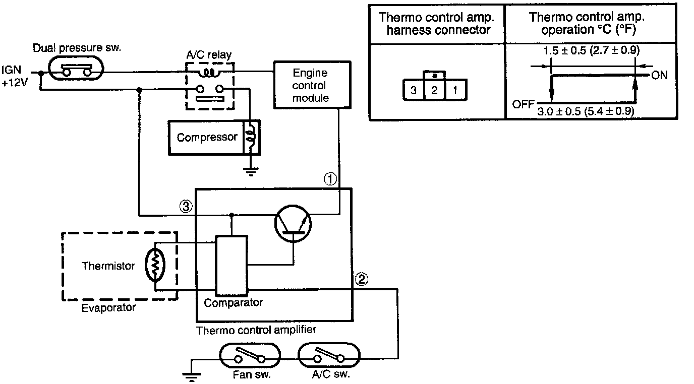 - The thermo control amplifier disconnects the magnet clutch circuit to prevent the evaporator from becoming frosted when the temperature of the evaporator discharge air drops close to 3°C (37°F). As the evaporator is cooled, the thermistor (located on the evaporator fin) interrupts the "base" current of the amplifier. This in turn deenergizes the A/C relay coil, which in turn disconnects the magnet clutch circuit.