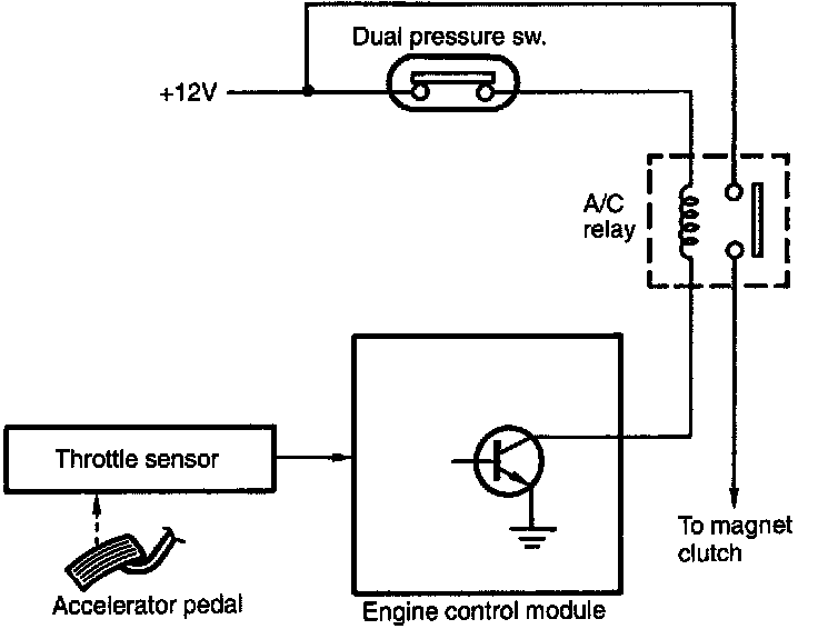 - The A/C relay breaks the current flow to the compressor, through the use of an output signal from the ECU, for a certain period of time when a "full-throttle" signal (emitted from the throttle sensor) enters the ECU while the compressor is operating. This prevents the degradation of acceleration performance and stabilizes. A/C relay located in the main fuse box.