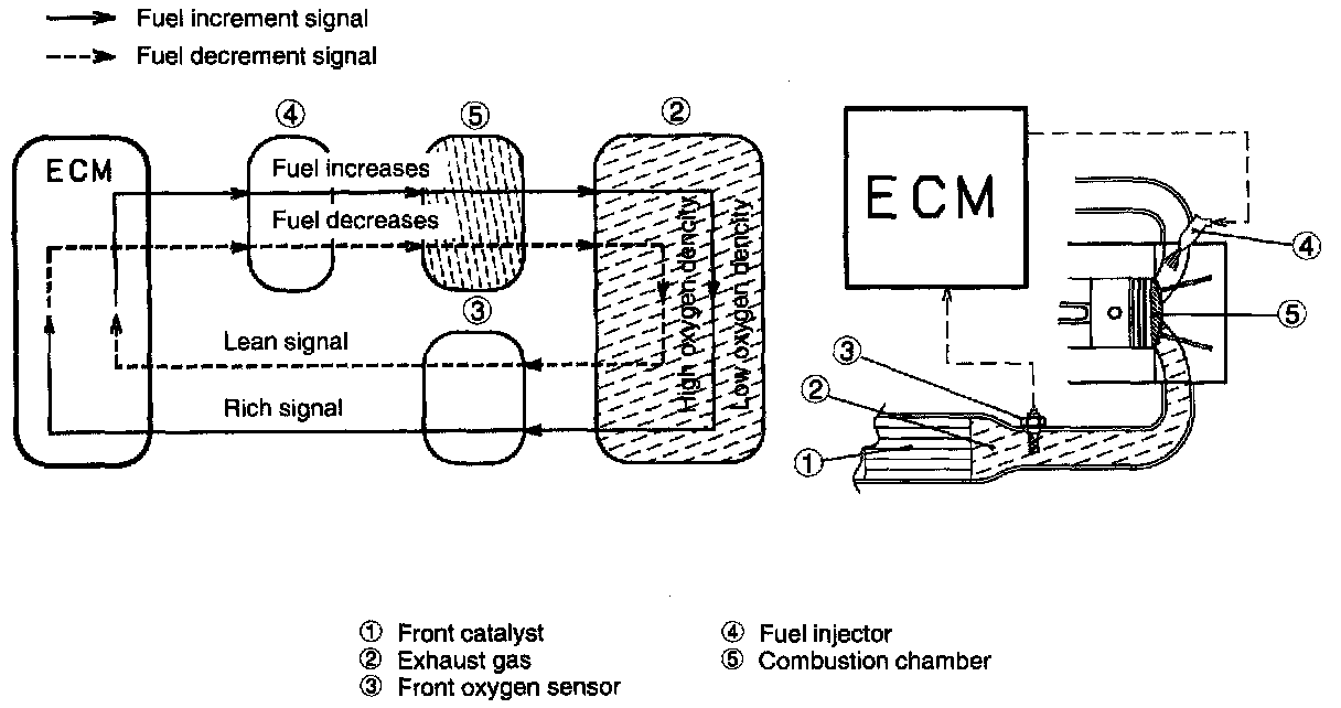 This feedback coefficient utilizes the front oxygen sensor's electromotive force (voltage) as a signal to be entered into the ECM. When low voltage is entered, the ECM judges it as a lean mixture, and when high voltage is entered, it is judged as a rich mixture. In other words, when the air-fuel ratio is richer than the stoichiometric mixture ratio, the amount of fuel injected is decreased. When it is leaner, the amount of fuel injected is increased. In this way, the air-fuel ratio is compensated so that it comes as close to the stoichiometric mixture ratio as possible on which the three-way catalyst acts most effectively. (CO, HC and NOx are also reduced when the air-fuel ratio is close to stoichiometric mixture ratio.)