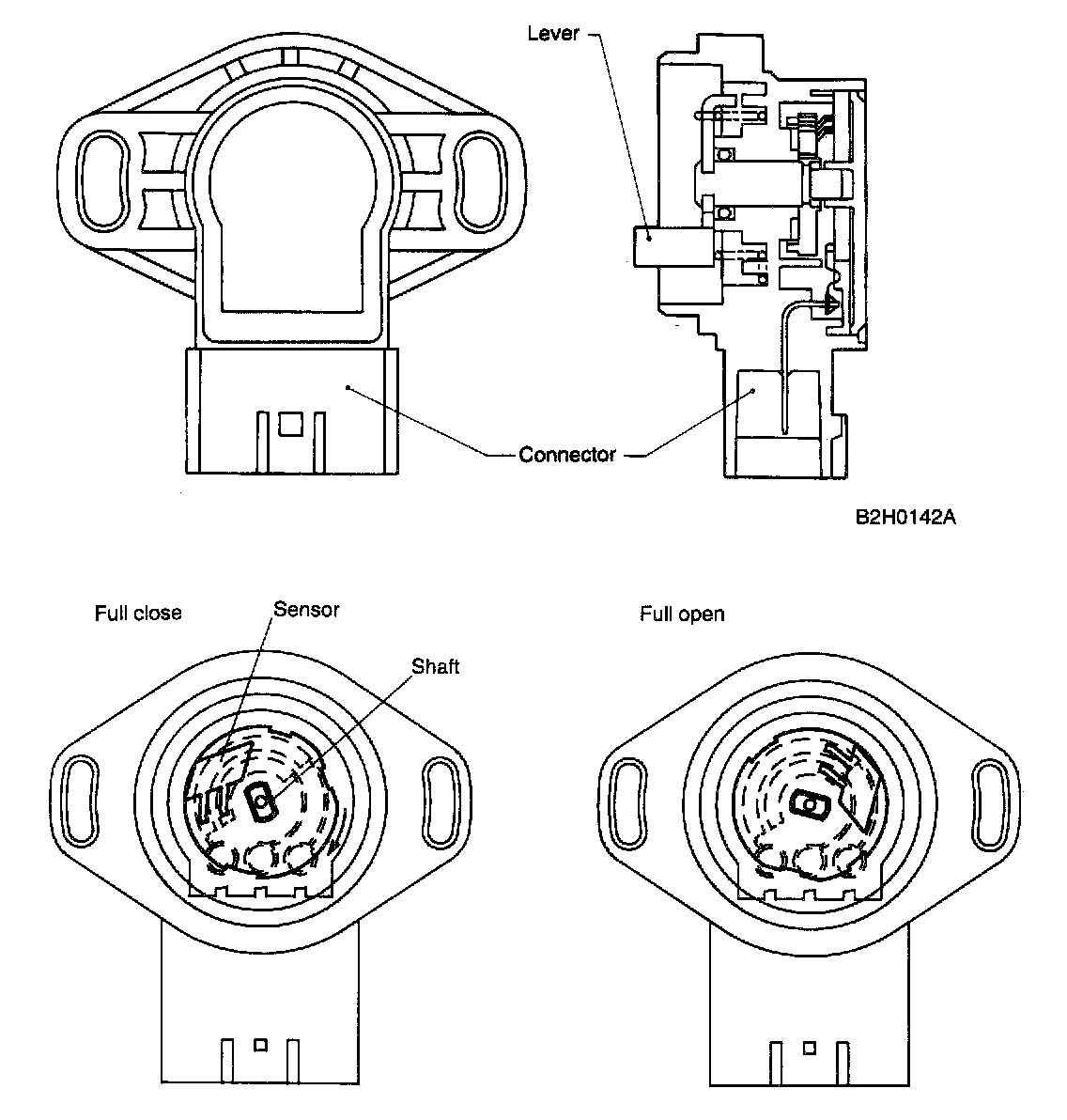 - This throttle position sensor sends the ECM a potentiometer output signal corresponding to the opening of the throttle valve. When the level of this signal exceeds a predetermined value, the ECM interprets it as complete closure of the throttle valve and makes a control most suitable for the engine operation with the throttle valve fully closed. For correcting error of this signal, the ECM is provided with a learning function.