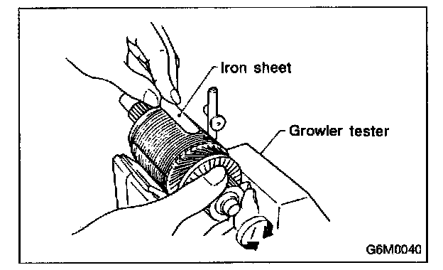 Check armature for short-circuit by placing it on growler tester. Hold a hacksaw blade against armature core while slowly rotating armature. A short-circuited armature will cause the blade to vibrate and 10 be attracted to core. If the hacksaw blade is attracted or vibrates, the armature, which is short-circuited, must be replaced or repaired.