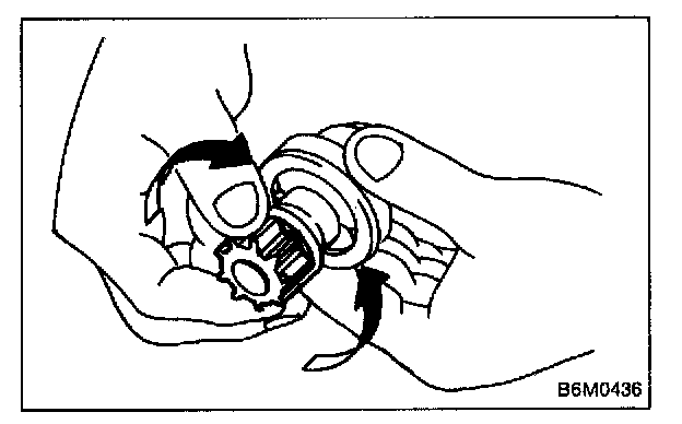 Inspect teeth of pinion for wear and damage. Replace it it is damaged. Rotate pinion in direction of rotation (clockwise). It should rotate smoothly. But in opposite direction, it should be locked.