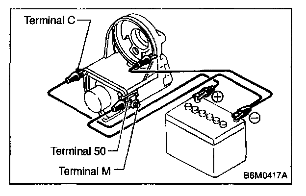 Connect two battery negative leads onto terminal 50 and onto switch body respectively. Then connect battery positive lead onto terminal C. Next, disconnect lead from terminal 50. Pinion should return immediately.