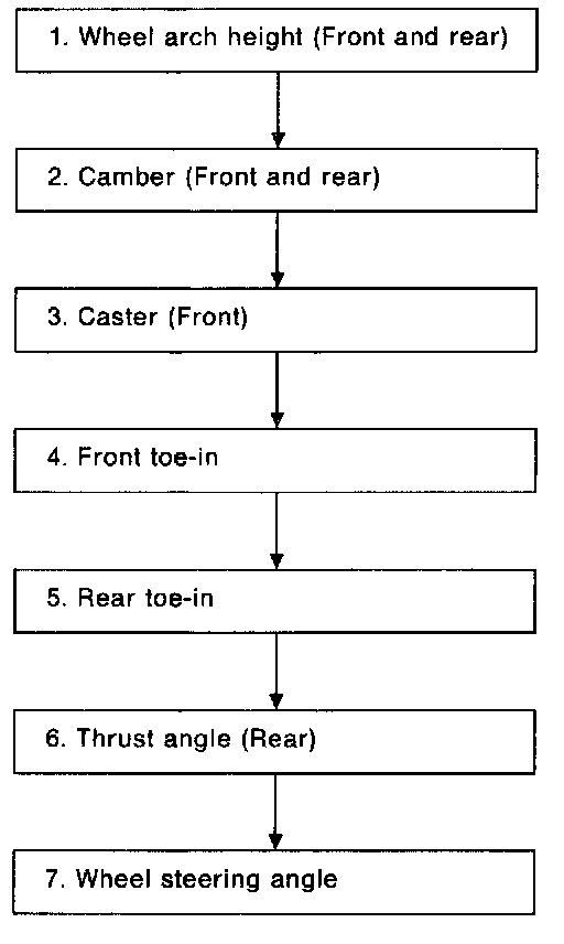 Check, adjust and/or measure wheel alignment in accordance with procedures indicated above: