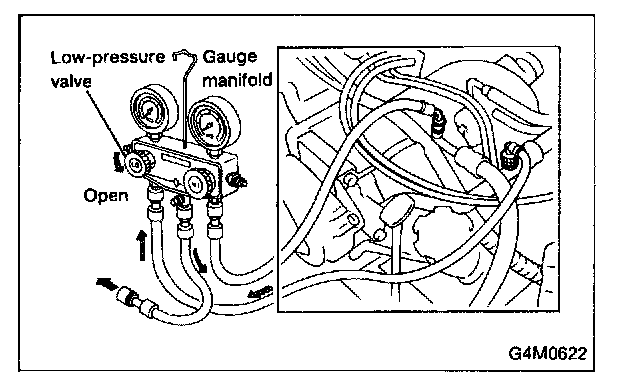 3. Open low-pressure manifold gauge valve slightly, and slowly discharge refrigerant from system.