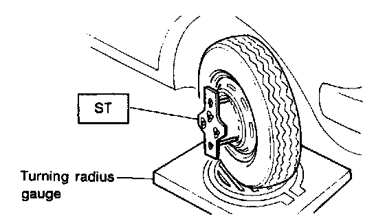 1) Place front wheel to be measured on turning radius gauge. Make sure vehicle is level and ground contacting surfaces of front and rear wheels are set at the same height.