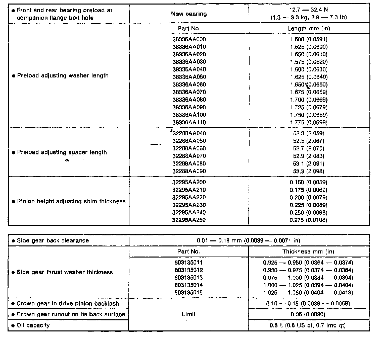 Differential Service/Overhaul Data: