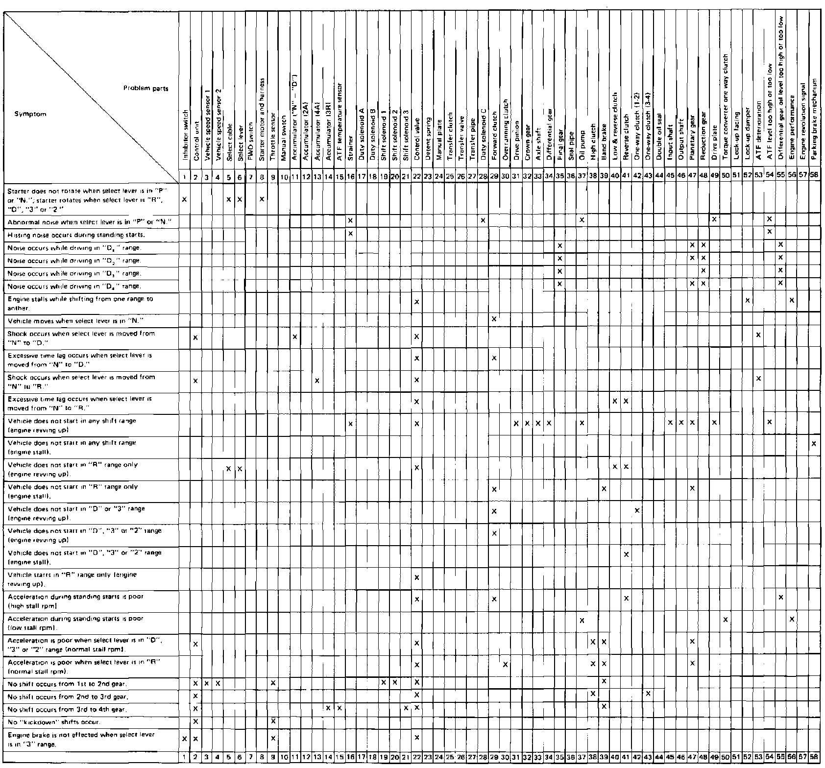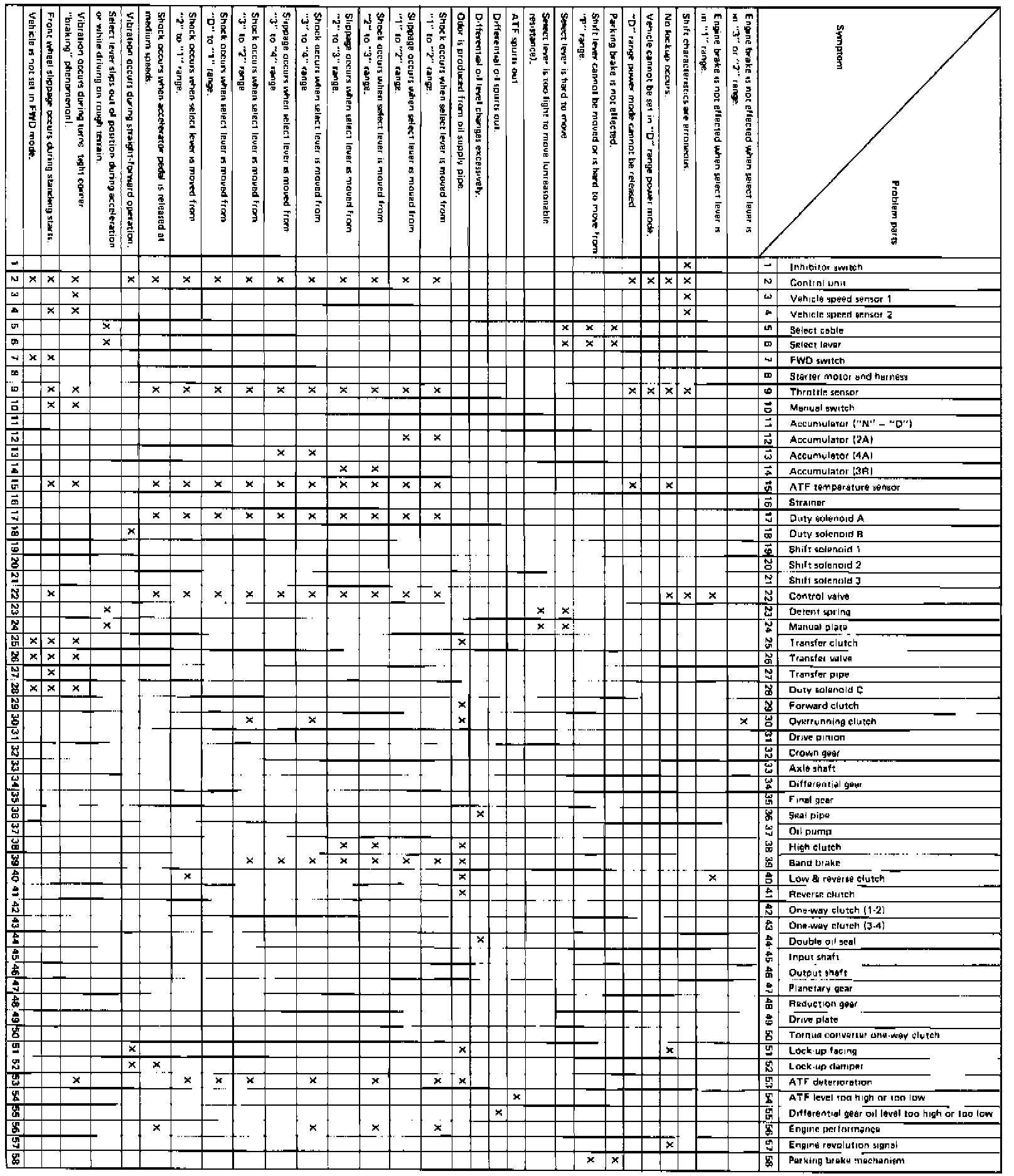 Problems in the electronic controlled automatic transmission may be caused by failure of the engine, the electronic control system, transmission components or by any combination of these. Troubleshooting should be started with simple and easy operations then proceeding to complicated and more difficult operations. When troubleshooting the transmission system, refer to Fig. 2, for the general troubleshooting chart.