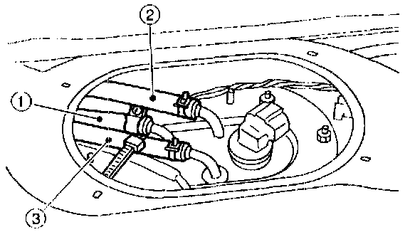 3) Disconnect fuel delivery hose (1) return hose (2) and jet pump hose (3).