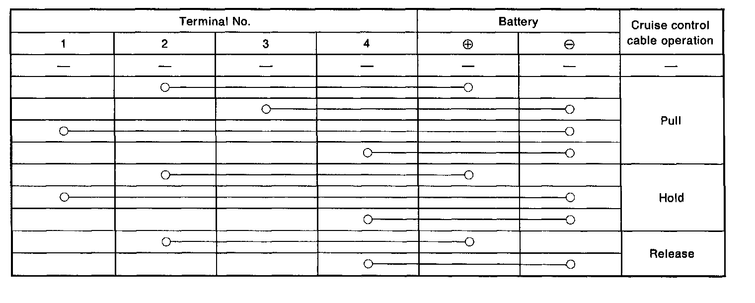 2. Make sure that cruise control cable moves smoothly when connecting + (positive) battery cable to terminal No.2 and - (negative) battery cable to terminals No.1, 3 and 4 of vacuum pump and valve connector.