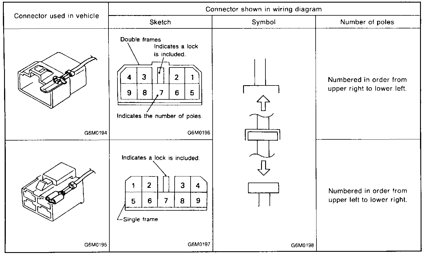 5) In wiring diagram, connectors which have no terminal number refer to one-pole types. Sketches of these connectors are omitted intentionally.