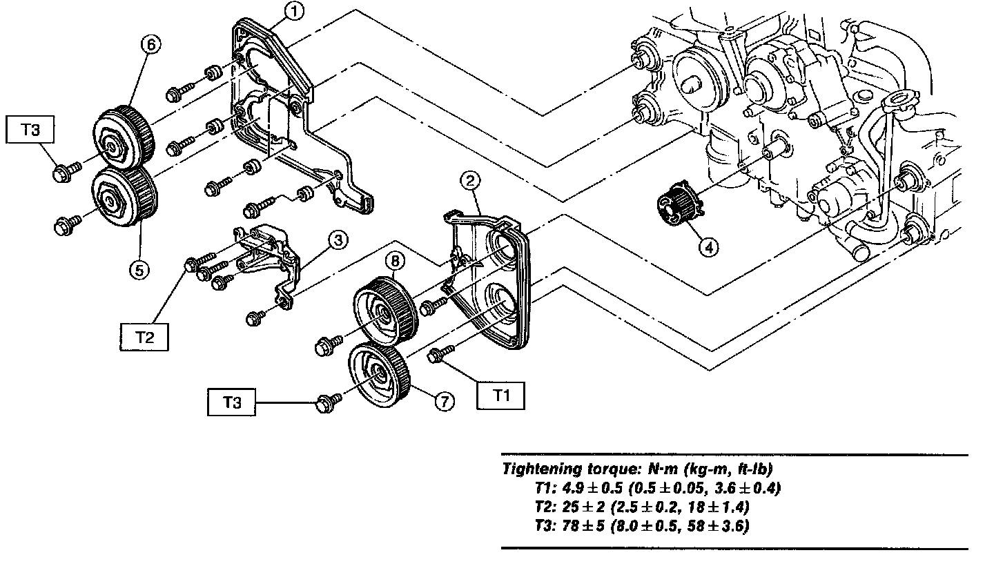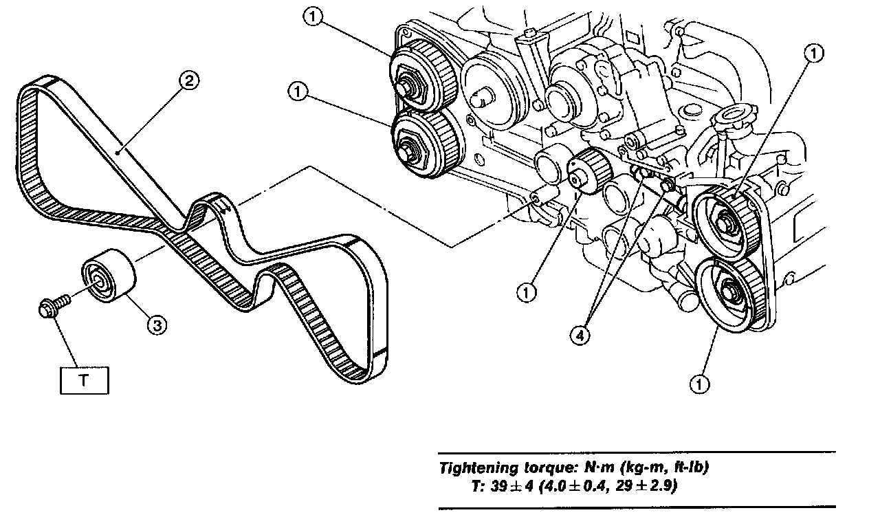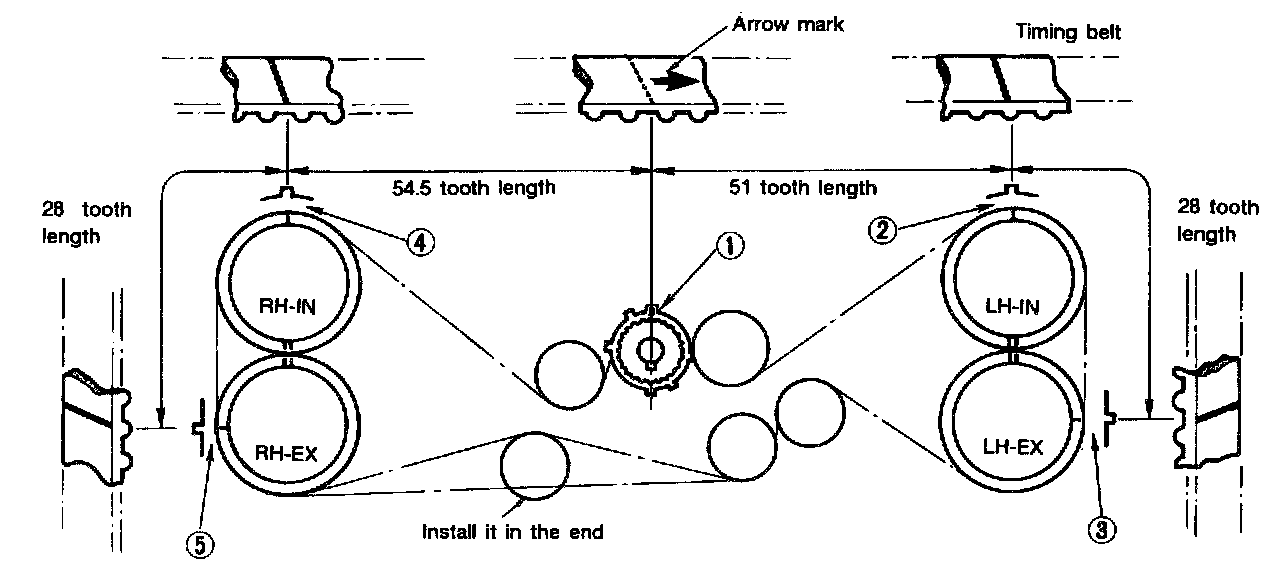 Align alignment mark on timing belt with marks on sprockets in the numerical order shown in figure. While aligning marks, position timing belt properly.