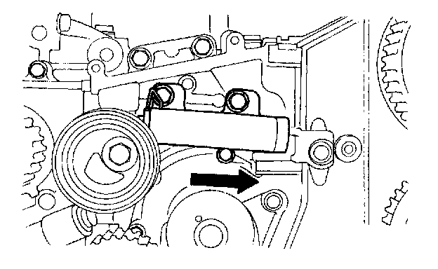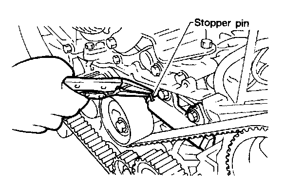 5) After ensuring that the marks on timing belt and sprockets are aligned, remove stopper pin from tension adjuster.