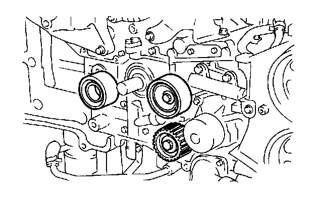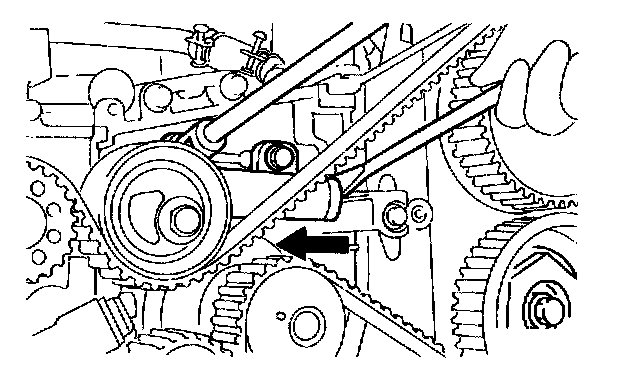 (5) Align single line mark on left-hand intake camshaft sprocket with notch on belt cover by turning sprocket clockwise (as viewed from front of engine). Insure double lines on intake and exhaust camshaft sprockets are aligned.