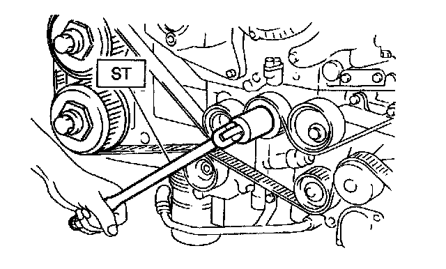 2) Remove pulley bolt. To lock crankshaft, use ST. ST 499977000 CRANKSHAFT PULLEY WRENCH