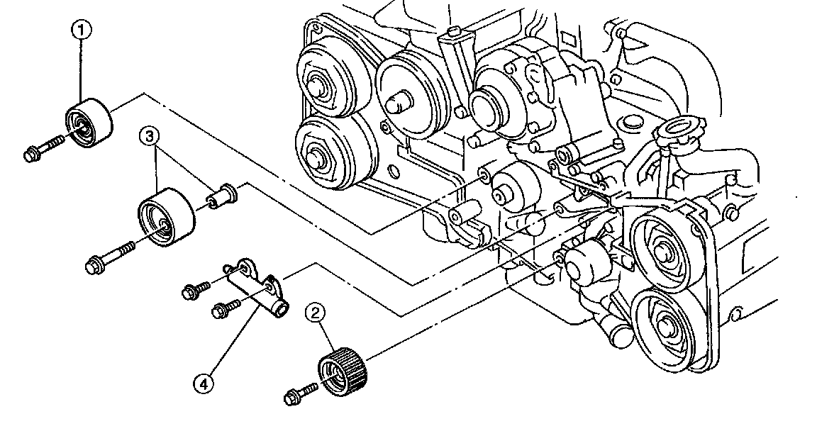 1) Remove V-belt cover, V-belt and air conditioning compressor drive belt tensioner.