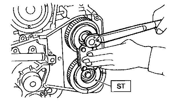 4) Remove right-hand exhaust camshaft sprocket. ST 499207300 CAMSHAFT SPROCKET WRENCH