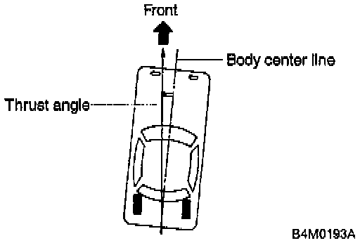 NOTE: Thrust angle refers to a mean value of left and right rear wheel toe angles in relation to vehicle body center line. Vehicle is driven straight in the thrust angle direction while swinging in the oblique direction depending on the degree of the mean thrust angle. Here, use only positive toe-in values from each wheel to substitute for a and b in the equation.