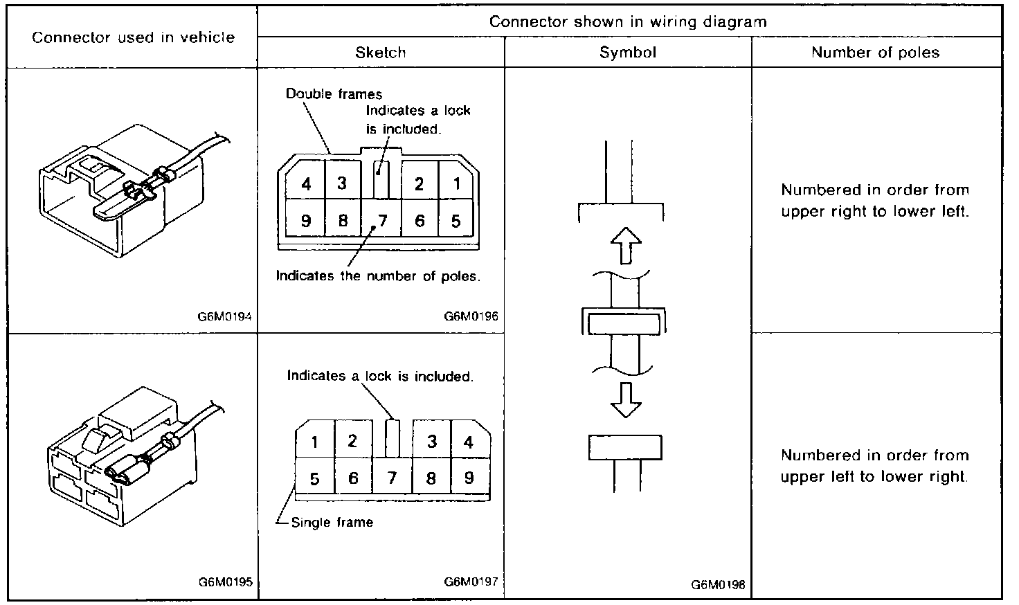2 The number of poles or pins, presence of a lock, and pin number of each terminal are indicated in the sketch of each connector.