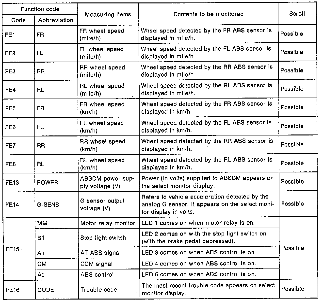 2) If freeze frame data is not properly stored in memory (due to a drop in ABS Control Module (ABSCM) power supply, etc.), a trouble code, preceded by a question mark "?", appears on the select monitor display. This shows it may be an unreliable reading.