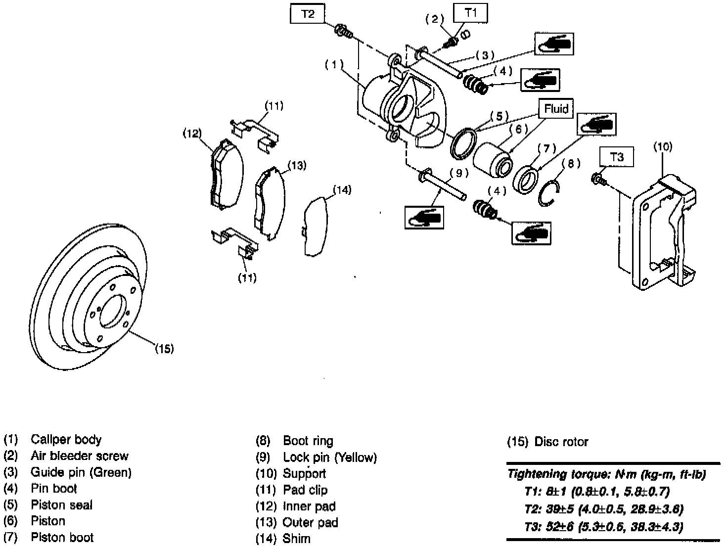 - If it is difficult to push piston during pad replacement, loosen air bleeder to facilitate work.