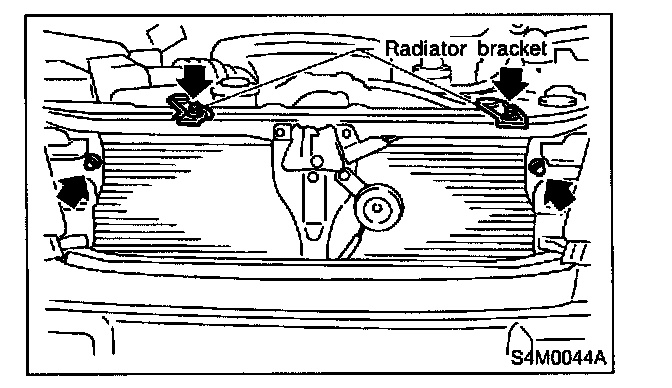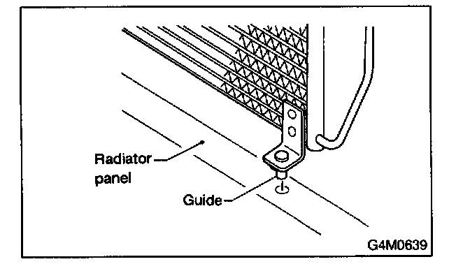 NOTE: After installing condenser, ensure that guide on lower side of condenser is inserted into hole in radiator panel. Tighten attaching bolts.