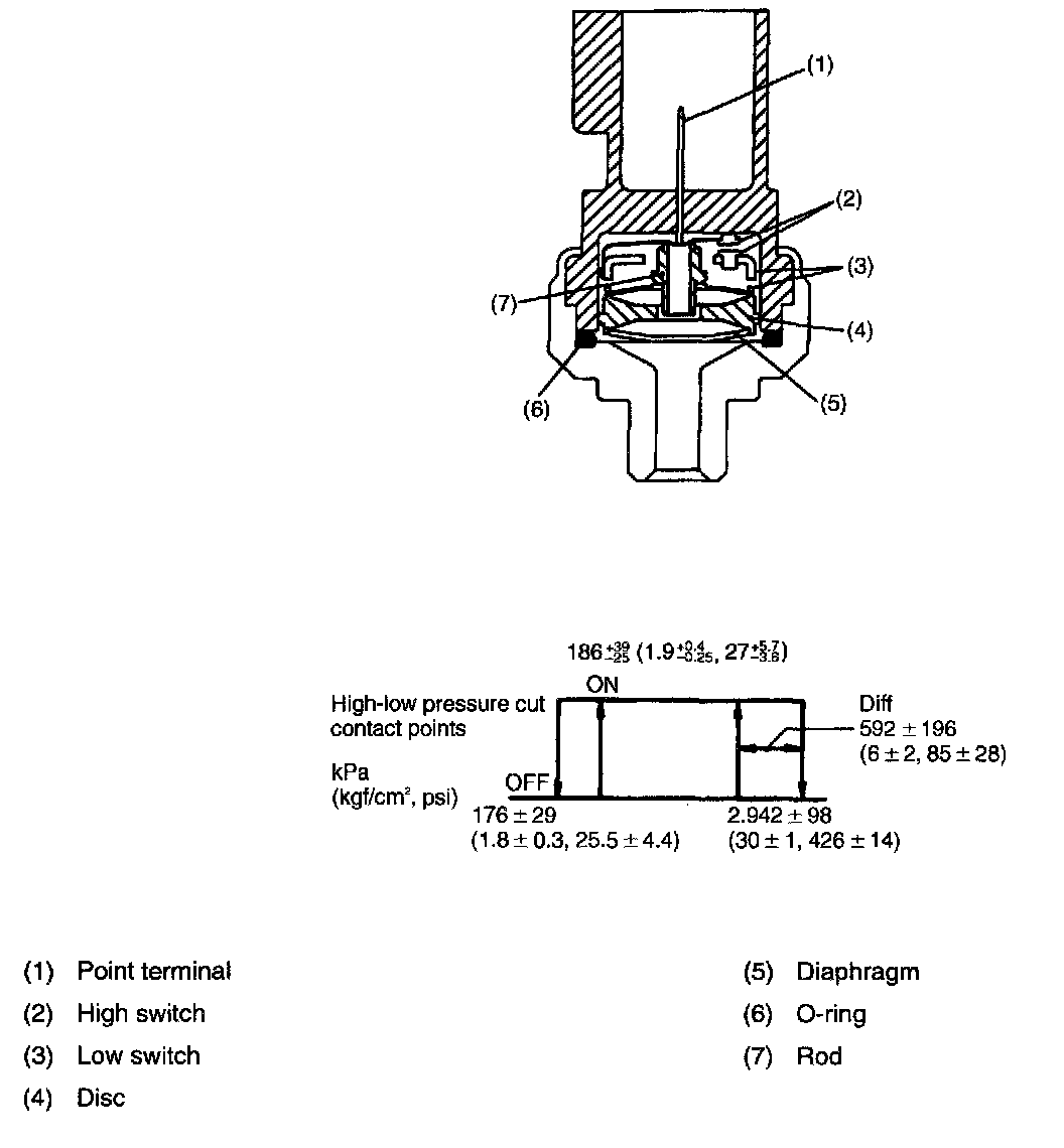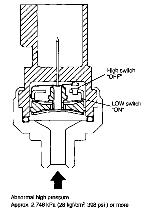 When refrigerant pressure is greater than 2,746 kPa (28 kgf/sq.cm, 398 psi), diaphragm spring is inverted so that high switch is opened (OFF) and low switch is closed (ON)