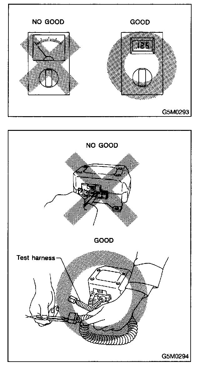 When checking the system, be sure to use a digital circuit tester. Use of an analog circuit tester may cause the airbag to activate erroneously. Do not directly apply the tester probe to any connector terminal of the airbag. When checking, use a test harness.