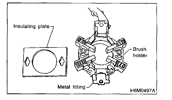 Slightly open the metal fitting holding the insulating plate to the brush holder. Remove the insulating plate.