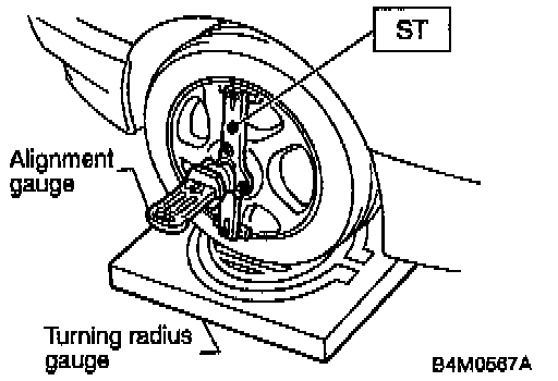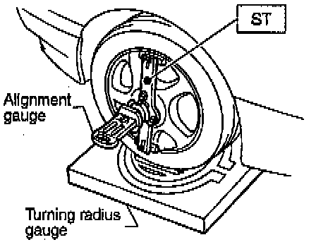 b. Set Special Tool (ST) into the center of the wheel, and then install the wheel alignment gauge.