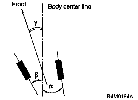 NOTE: Thrust angle refers to a mean value of left and right rear wheel toe angles in relation to vehicle body center line. Vehicle is driven straight in the thrust angle direction while swinging in the oblique direction depending on the degree of the mean thrust angle.
