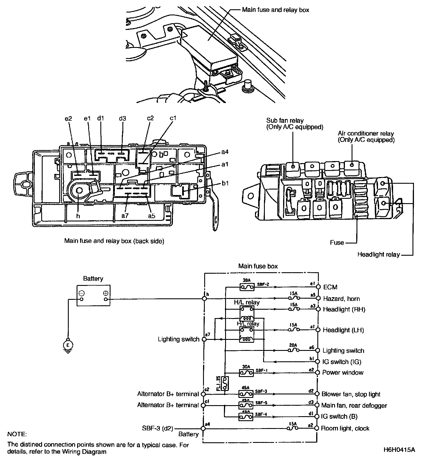 The main fuse and relay box is installed at the rear of the battery on left side of the engine compartment.