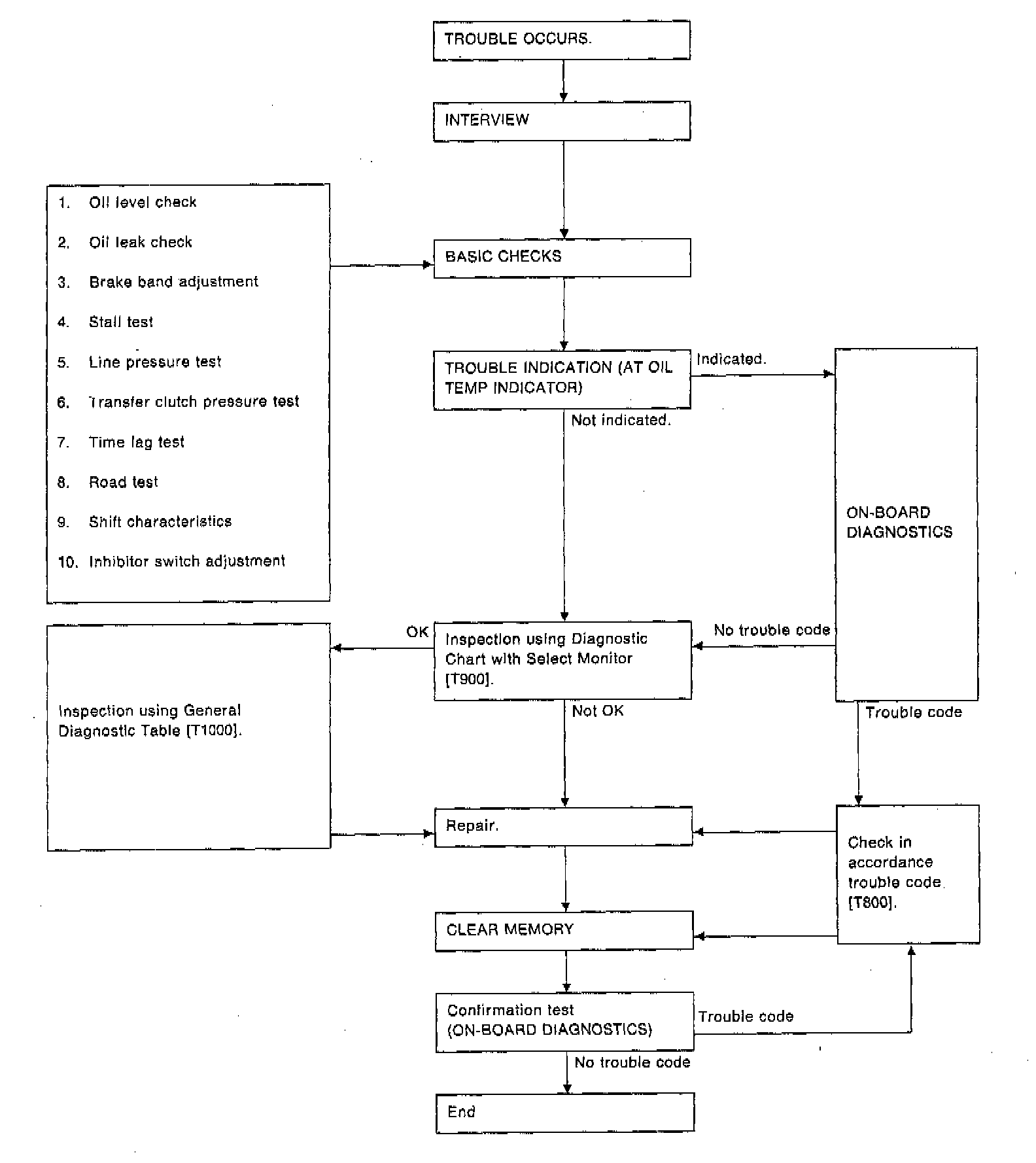 The malfunctioning part or unit can be determined by a trouble code during on-board diagnostics operation. Problems which occurred previously can also be identified through the memory function.