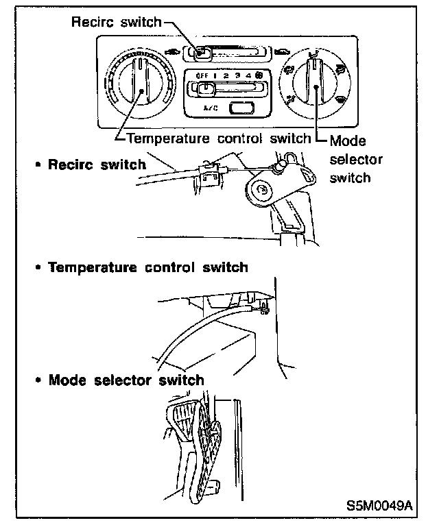 3. Disconnect temperature control cable and mode door control cable from heater unit then disconnect recirc control cable from intake unit.