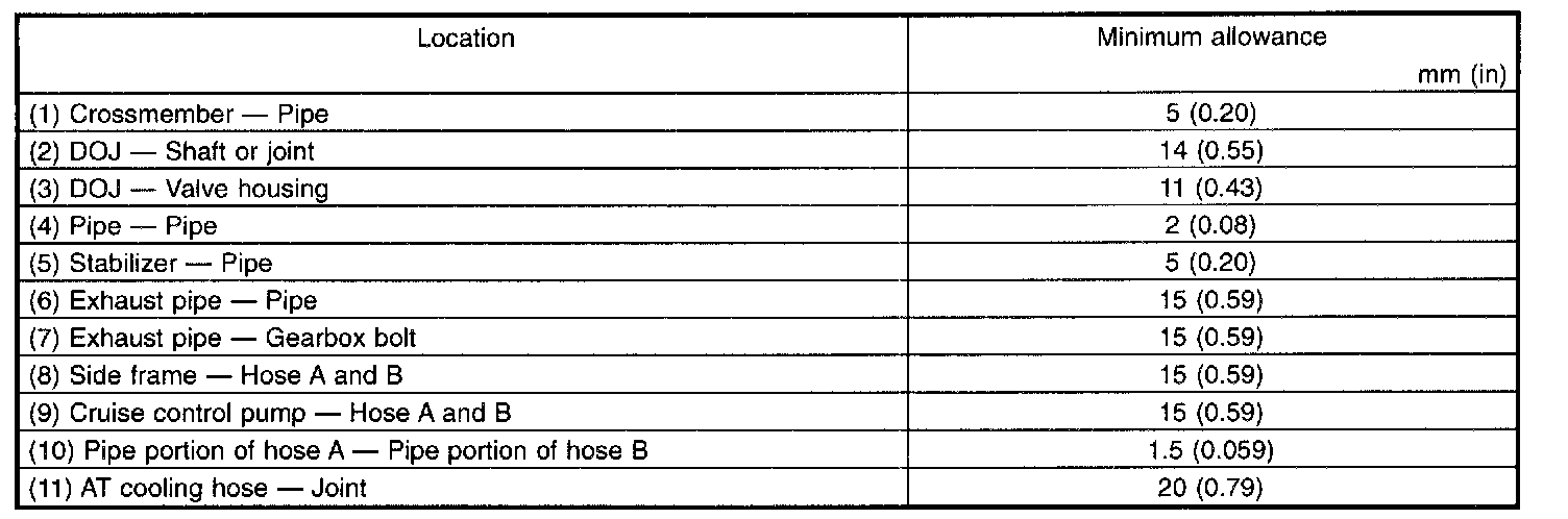 This table lists various clearances that must be correctly adjusted to ensure normal vehicle driving without interfering noise, or any other faults.