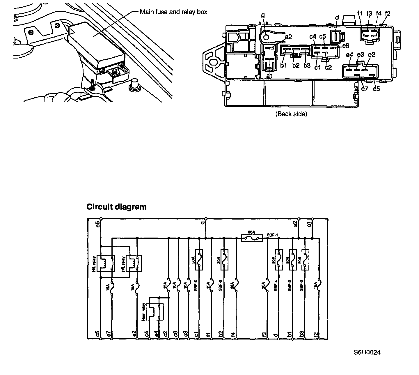 The main fuse and relay box is installed at the rear of the battery on left side of the engine compartment.