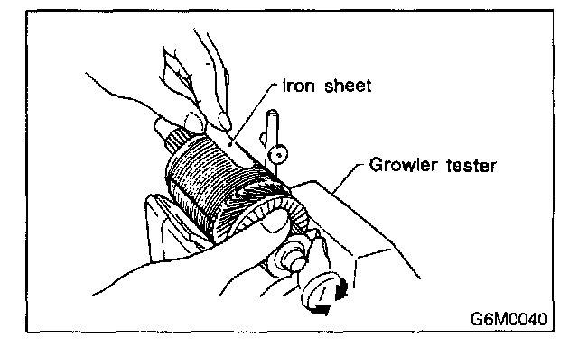 Check armature for short-circuit by placing it on growler tester. Hold a hacksaw blade against armature core while slowly rotating armature. A short-circuited armature will cause the blade to vibrate and to be attracted to core. If the hacksaw blade is attracted or vibrates, the armature, which is short-circuited, must be replaced or repaired.