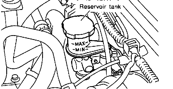 1) Check fluid level using a scale on outside of reservoir tank. If the level is below "MIN", add brake fluid to bring it up to "MAX".