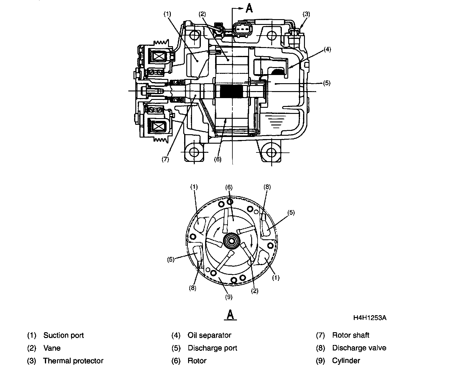 CompressorThe vane rotor type compressor turns around the center axis of the elliptical cylinder, and the vanes, with their ends in contact with the inside wall of the cylinder, move up and down the rotor grooves. The vanes are positioned around the rotor, each equally spaced apart from another. Both sides of the cylinder are sealed by side blocks. The space, enclosed by the neighboring vanes, two side blocks, outer circumference of the rotor and inside wall of the cylinder, becomes smaller as the rotor turns, thereby compressing the internal gas. When the end of a vane sliding on the inside wall of the cylinder goes past the suction port, the vane closes the suction port. The compression stroke at the position. When the gas ahead of the vane is compressed and discharged through the discharge valve, the next vane is already on the suction stroke. Since suction and compression of the gas are separately performed in this manner, the compressed gas left behind in the discharge port never returns to the suction port. Since no suction valve is required, there is no loss caused by a suction valve. (A high pressure trigger valve provided on the rear head to apply a pressure to the back plane of vane.)
