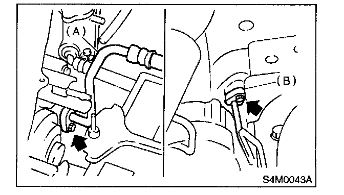 5. Disconnect high-pressure hose (A) and high- pressure pipe (B) from condenser.