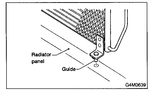 NOTE: After installing condenser, ensure that guide on lower side of condenser is inserted into hole in radiator panel. Tighten attaching bolts.