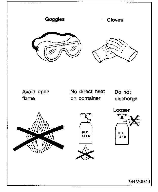 Handling of RefrigerantBecause refrigerant boils at approx. -30 °C (-22 °F) at sea level, it is cold enough to give you severe frostbite. Always wear goggles to protect your eyes and gloves to protect your hands. Also, even under the pressures normally found in CFC-12 containers, refrigerant will boil with the addition of heat. This could raise the pressure inside the container to a dangerous level.