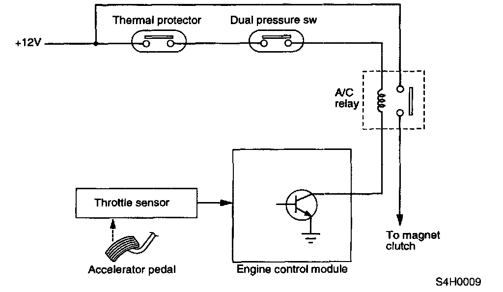 Acceleration Cut SystemThe A/C relay turns the A/C system on or off. The on-off operation of the switch is transmitted to the ECM.