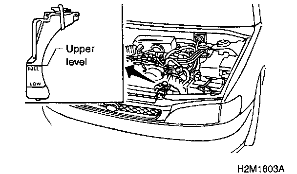 7. If engine coolant level drops from upper level of reservoir tank, add engine coolant to upper level.