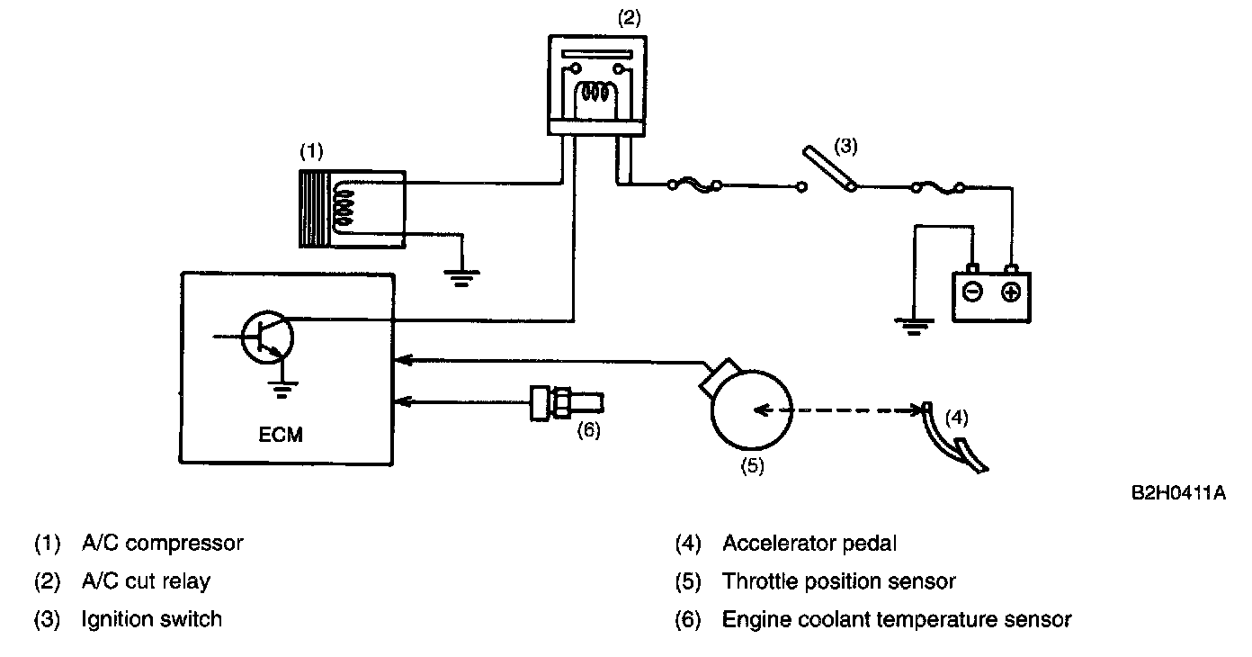 - When the ECM receives a "full-open" signal emitted from the throttle position sensor while the air conditioning system is operating, the A/C cut relay turns off for a certain period of time to stop the compressor. This prevents degradation of output during acceleration and stabilizes driveability.