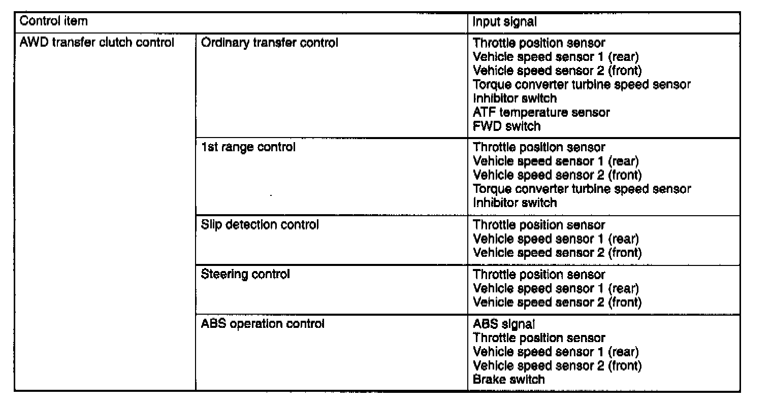 Transmission Control Module (TCM)TCM receives various sensor signals and determines the running conditions of the vehicle. It then sends control signals to each solenoid according to the preset gearshift characteristic data, lockup operation data, and transfer clutch torque data (duty ratio).